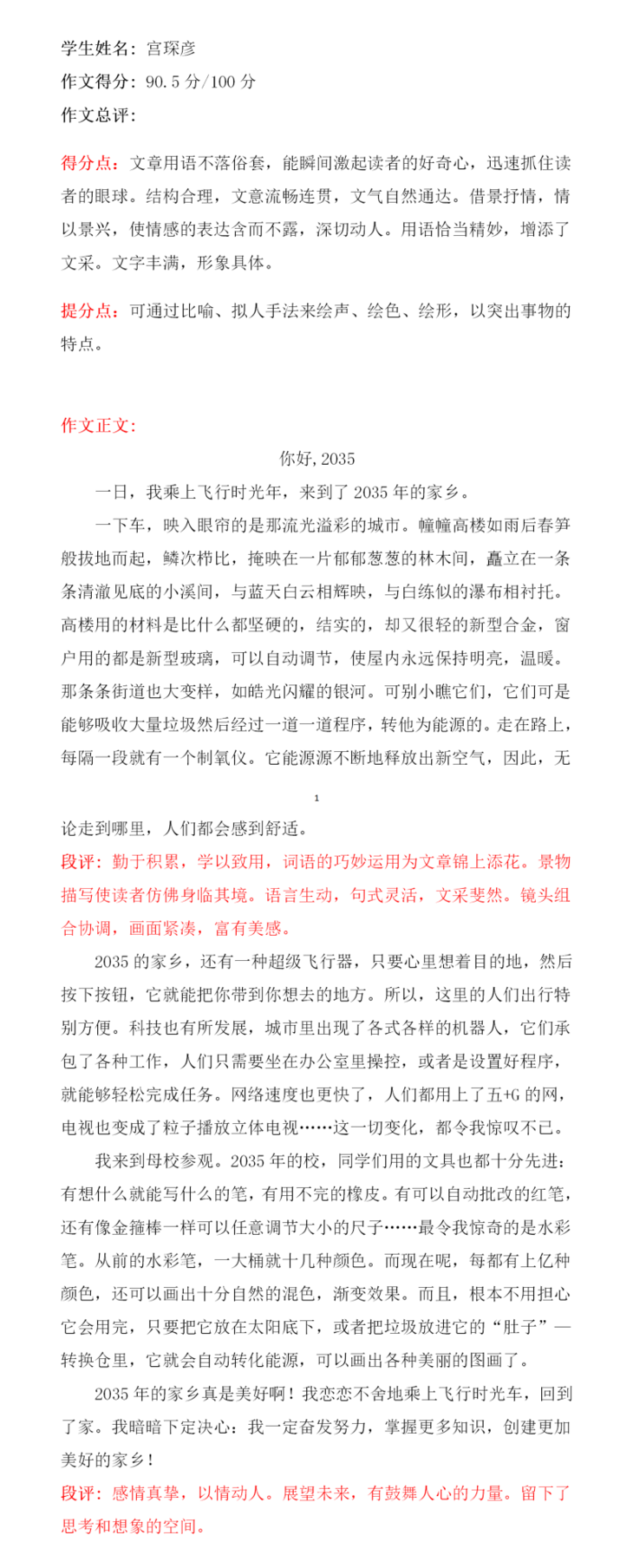 小作者想象力十分丰富,描写细致,畅享了2035年家乡发生的巨大变化。将读者带入了一个干净整洁,空气清新,科技发达的未来城市环境当中。结尾不但提出了希望,而且还写出了小作者未来的打算,非常不错。