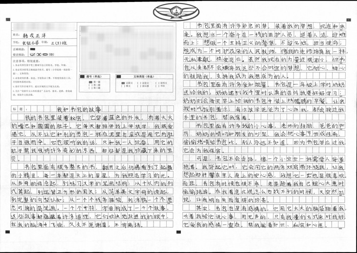 郭昀轩同学聪明伶俐,热爱阅读,是个很有知识底蕴的孩子。本篇文章构思巧妙,想象奇特,简单的故事中蕴含深刻的道理。在小作者的笔下,书包不仅仅是工具,更承载着孩子美丽的梦想,读来让人不禁对书包产生一份不一样的情愫,是篇成功的作品!