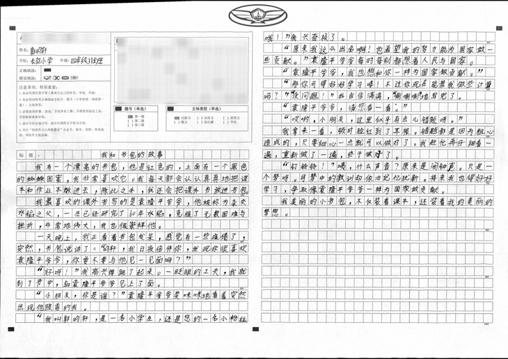 书包的主要功能是学习知识,而学到知识的前提是先培养好的学习习惯。因此,我运用想象的手法,构思了自己和袁隆平爷爷在梦中相见的故事。梦里,我特别崇拜袁隆平爷爷的成就,想成为像他一样的人,但是却输在了自己粗心大意的学习习惯上。由梦境到现实,我也记住了这个深刻的教训,表达了想要好好学习的愿望,同时在结尾升华主题,抒发了自己对小书包的喜爱及对梦想的追求。