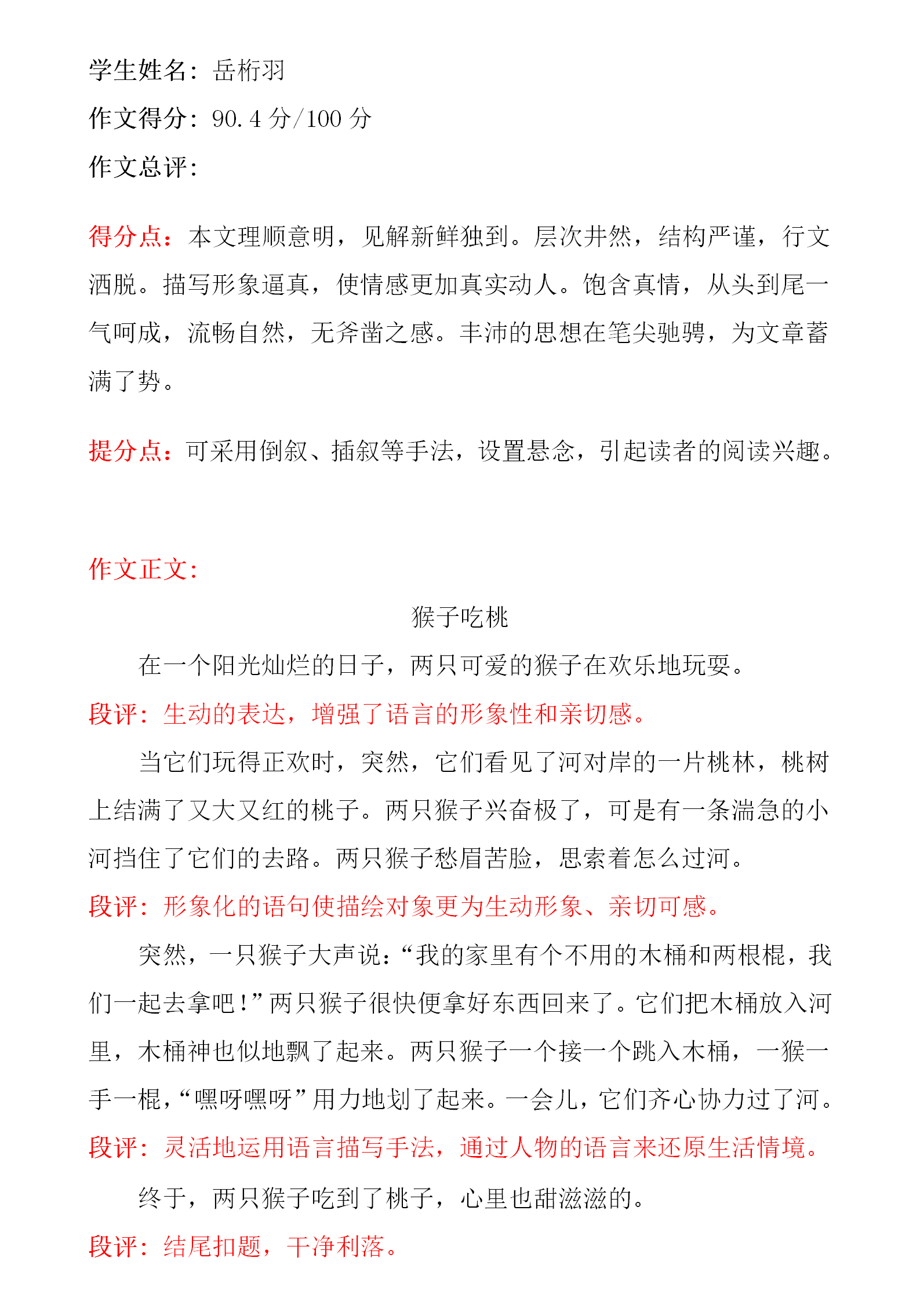 本篇文章根据画面展开丰富想象,观察细致,积极向上,富于童趣,两只聪明,有爱心的小猴子跃然纸上。