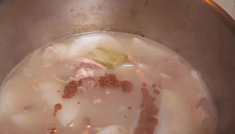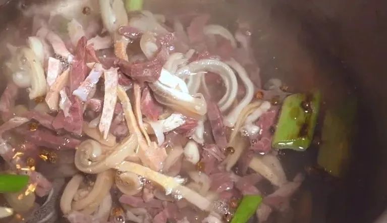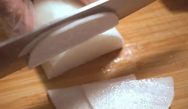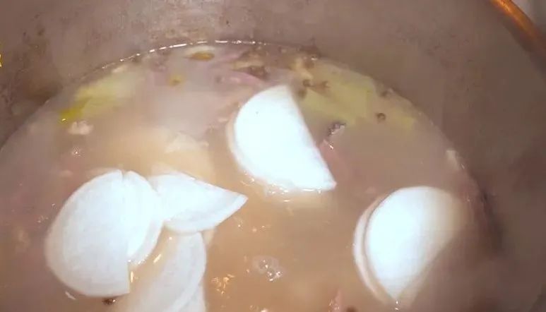 白萝卜切片,羊杂炖煮20分钟后加入白萝卜,再继续炖煮10分钟