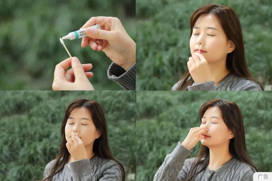 方法1:使用前先清洁鼻腔,去除鼻腔内的附着物,取本品适量涂抹于鼻前庭部位,轻捏鼻翼使其均匀;