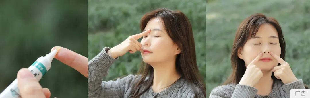 方法2:取本品适量涂抹于印堂、迎香穴等部位,进行鼻部按摩;