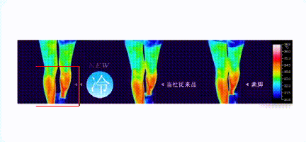 来做个小测试更加直观,从红外线下就能很清楚的看出,穿着凉感丝袜的腿,是呈现蓝绿色的状态,说明是持久保持降温的。