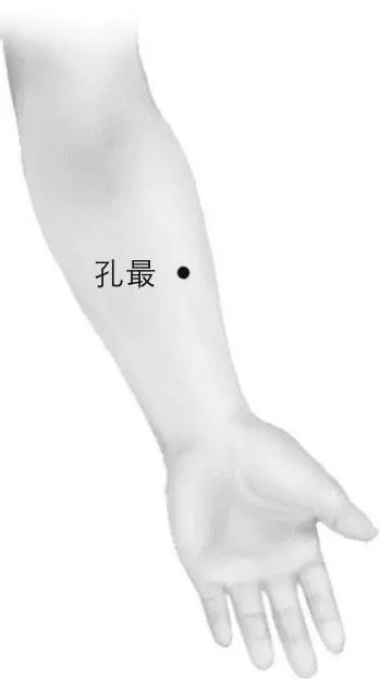 孔最穴在前臂掌面桡侧(大拇指方向),在尺泽穴与太渊穴(腕部动脉搏动处)连线上,腕横纹上七寸(手腕至肘共十二寸,按比例取穴)。孔最穴对风寒感冒引起的咳嗽和扁桃体炎效果不错,还能治疗痔疮。