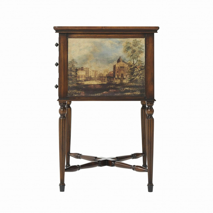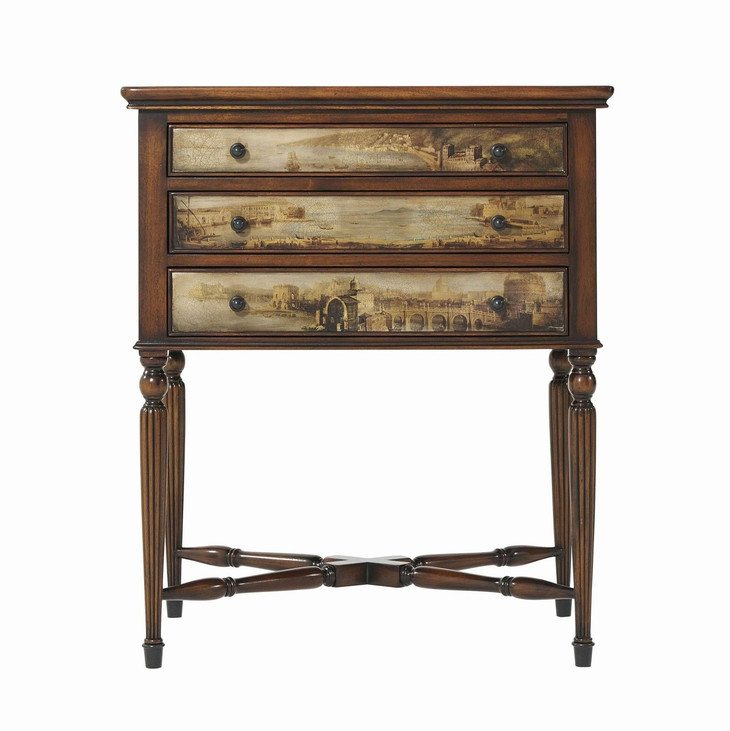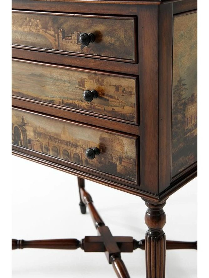 这款边桌巧妙地将西方古典风景画入融桌体之上,搭配经典的X型纺锤型连杆,倒锥凹槽腿,加大上容量的三层抽屉,完美的诠了释家具双的重属性:“既物是质产品,又是艺术创作”。