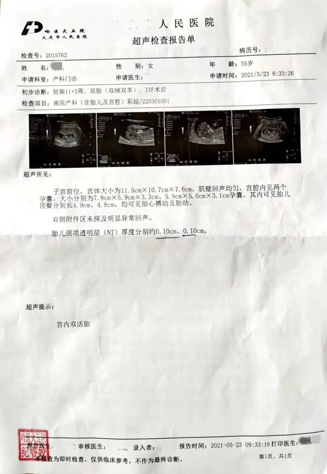 今年3月21日回到医院,医生对我们的身体进行了评估,也告知了我们这9个受精卵中有8个配成胚胎,其中5个优胚,3个普胚。医生给我做了一系列检查后,建议我当天就移植两枚优等鲜胚,余下的全部进行了养囊。整体过程十分顺利,当天我便返回了家中。一周后打电话咨询得知养成了3个囊胚。