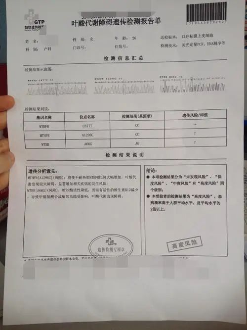 想知道是否缺乏叶酸可以通过检测血清叶酸水平来反应。叶酸代谢检测时,会综合下面图中的2个基因的3个位点得出一个叶酸代谢基因风险的评估。如图: