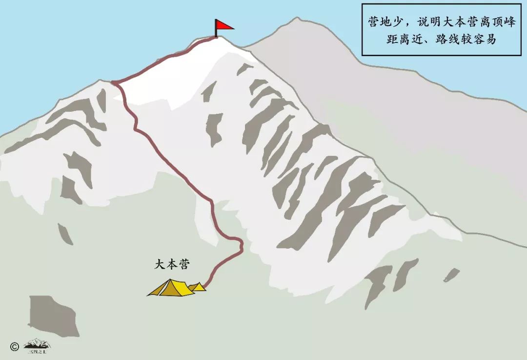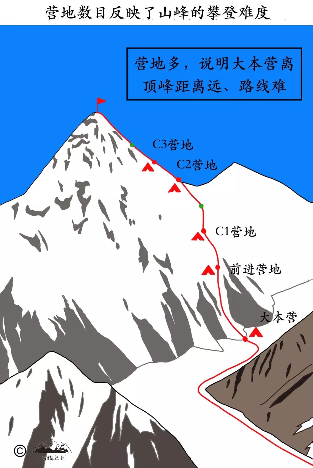 高海拔攀登需要设置营地来保障后勤和登山者的休息及救助,营地数目越多,说明大本营离顶峰的距离越远、该路线越难。