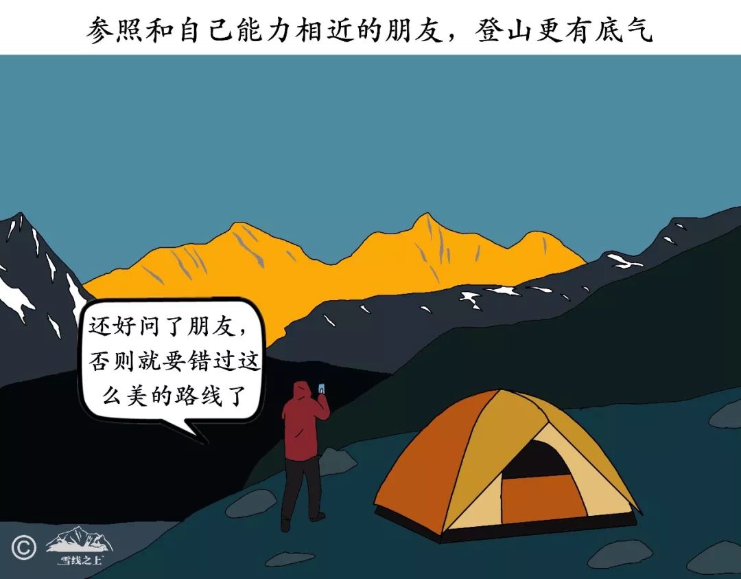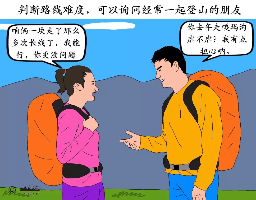 身边经常一起登山的山友与你体力、技术、难易感受相近,如果他刚好走过你想走的路线,那就是你最生动的参照。他觉得不难的,你也会容易胜任。