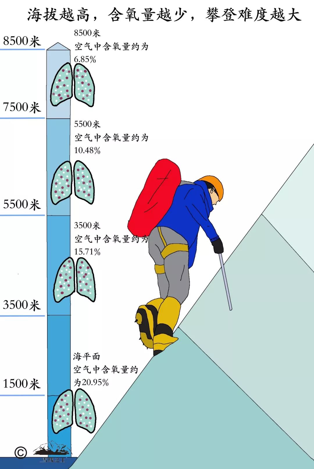 海拔之所以能判断该山峰的难度,首先是因为海拔越高,山体越大,攀登越费劲。其次海拔越高,空气中的含氧量就越少。