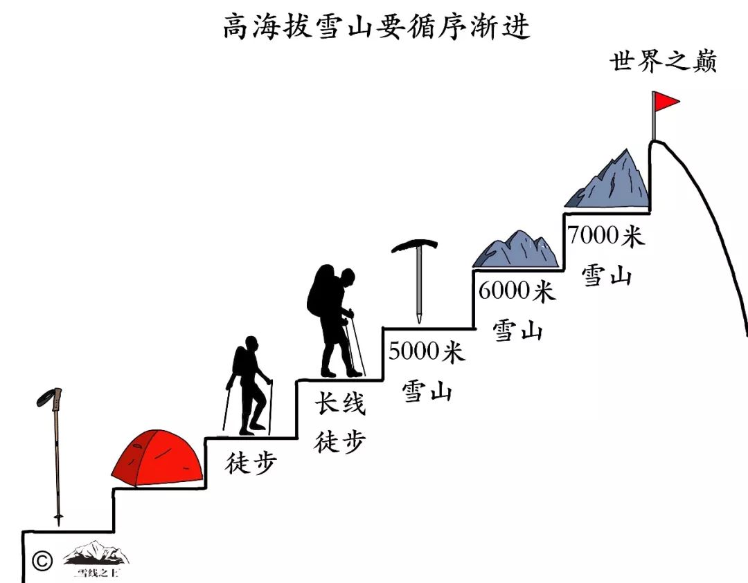因此,从5000、6000到7000、8000米级雪山,你要逐步攀登,循序渐进。