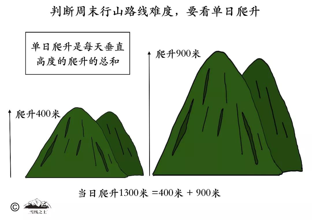 登山需要不断上坡下坡,当日爬升的垂直高度总和就是单日爬升,它可以预估该路线的难度。
