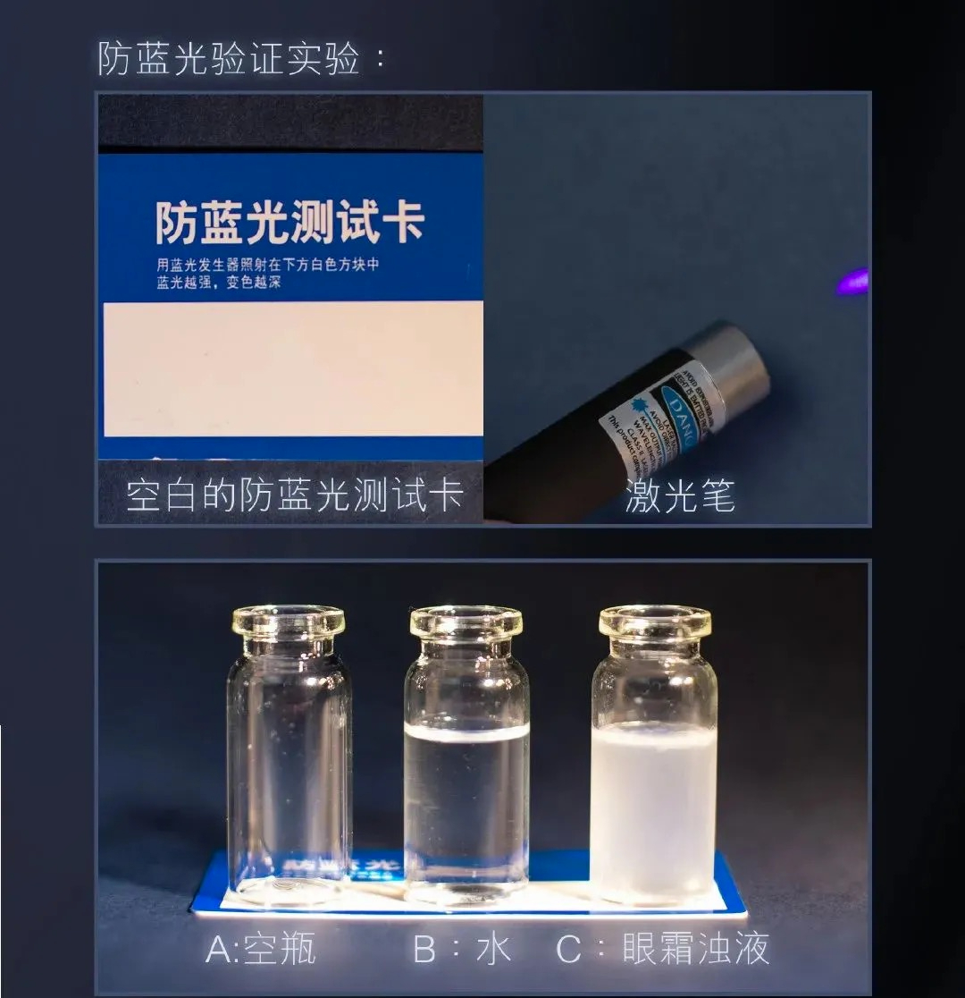 空瓶A和水瓶B被照射后都出现蓝光损伤; 而含有雅诗兰黛眼霜的液体C则有效地阻挡了蓝光。