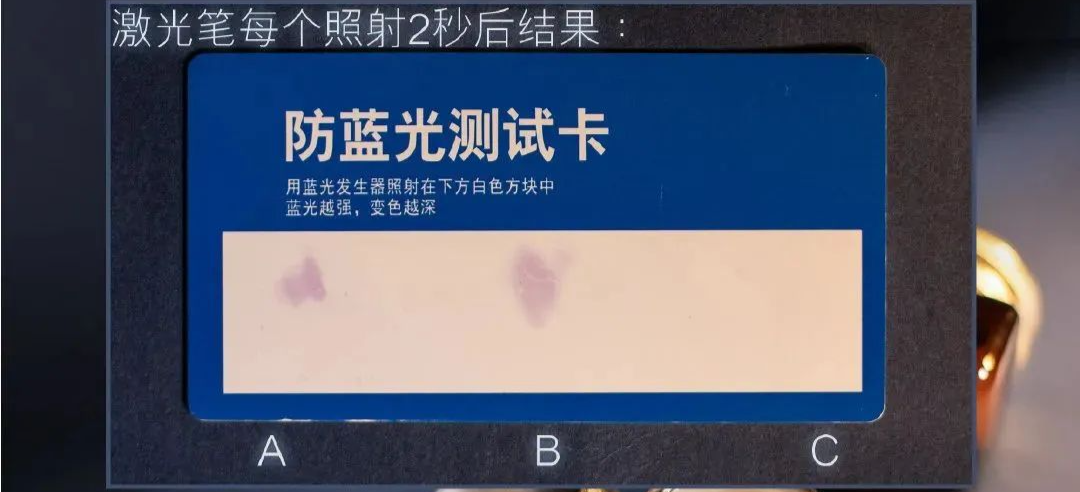 3、将3个瓶子放在防蓝光测试卡上,并用激光笔对准瓶口照射。