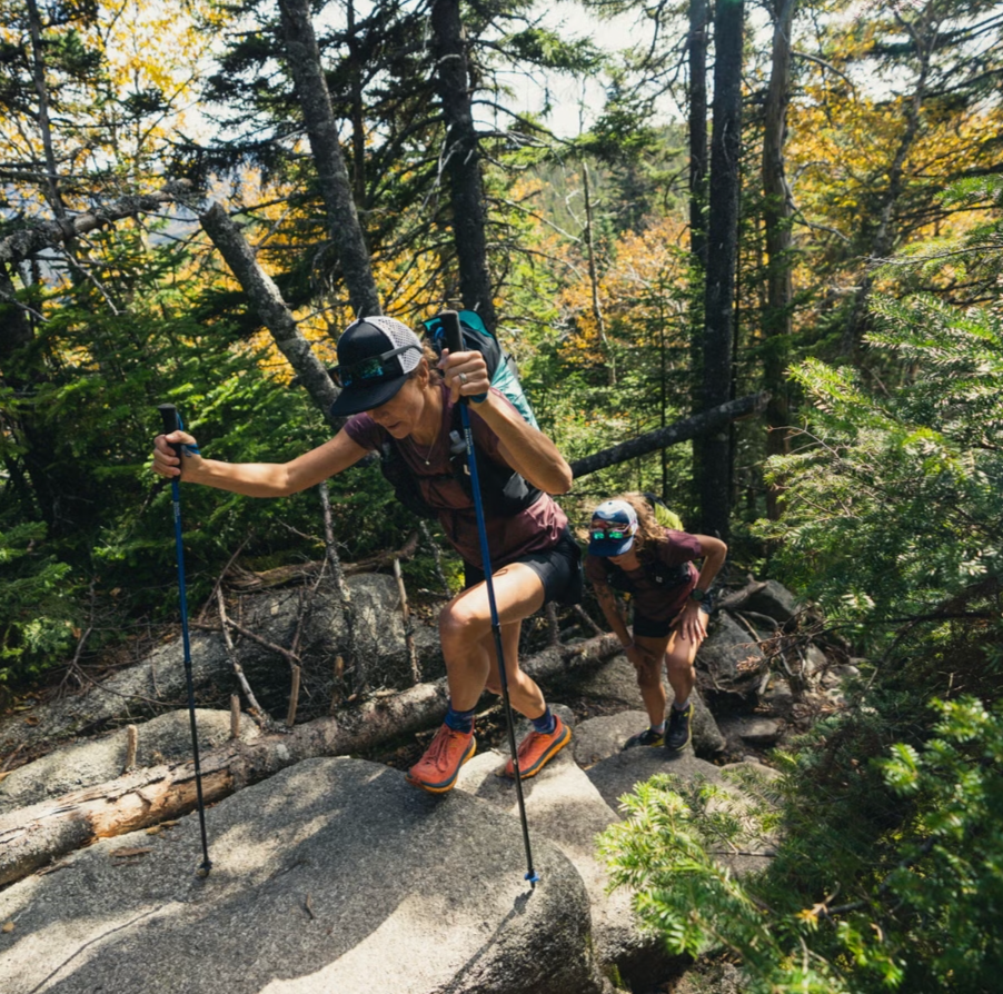 另一个适合用登山杖的时机是下坡,因为它们能帮助你在岩石或危险路况下保持平衡,同时减少肌肉和关节的离心负荷(即身体向下运动时承受的冲击力)。在超长距离比赛中,当双腿已经力竭、油箱见底时,登山杖甚至可能成为救命稻草。