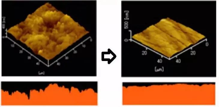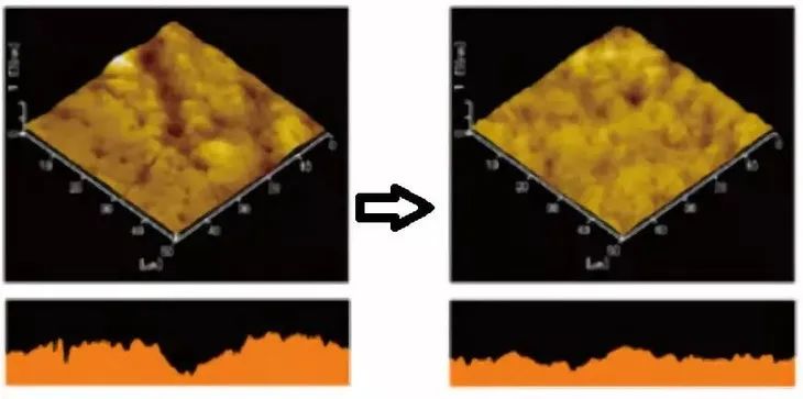 👆 实验图谱:去粘结之后牙釉质(左,粗糙度35.27)与nanoHAP处理之后的牙釉质(粗糙度21.68)