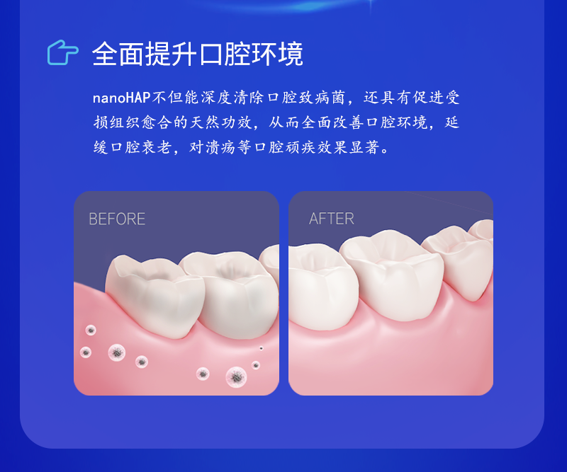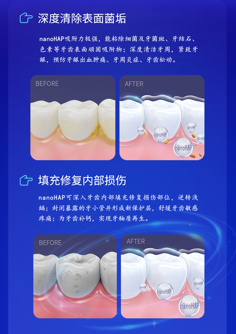 在刷牙过程中,nanoHAP能有效吸附细菌和牙菌斑,刷牙摩擦和漱口时,更容易轻松去除牙齿表面的牙垢、牙渍、牙菌斑和牙结石。