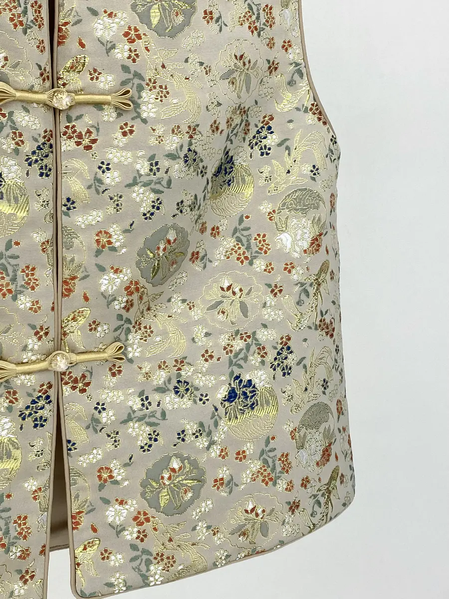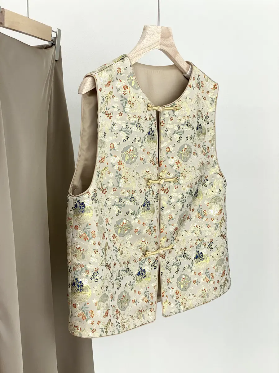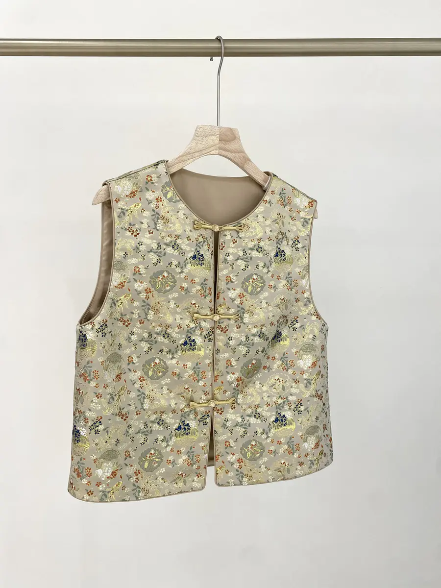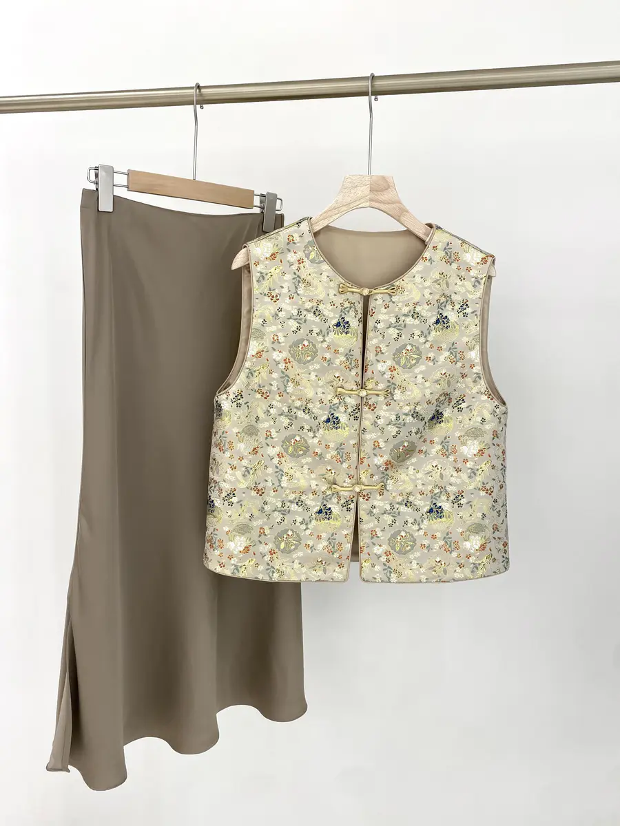 新中式马甲设计,古典韵味,可单穿,或者做外套搭配T恤穿着,下半身搭配香槟色缎面半裙,气场十足~