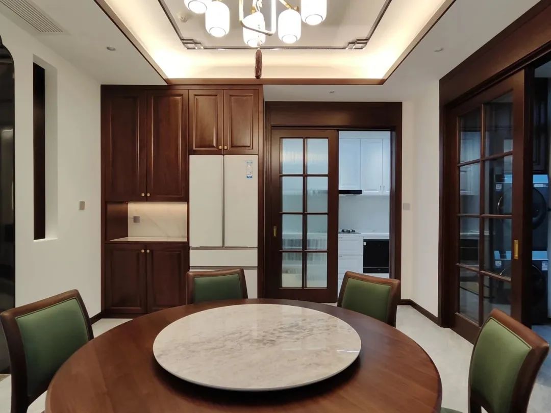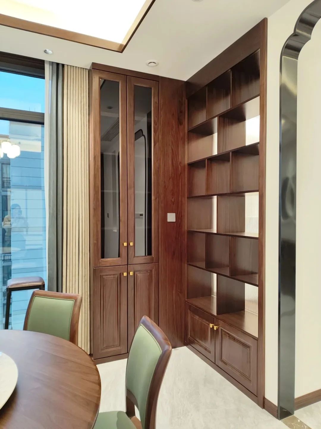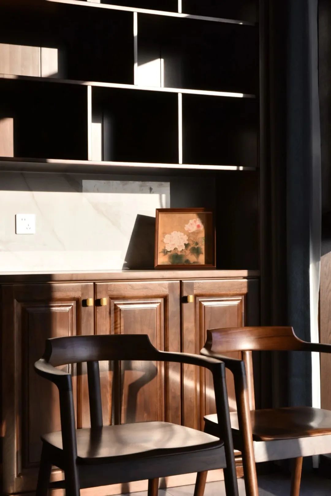 设计风格上,餐厅空间和客厅空间保持一致,黑胡桃材质经岁月沉淀,打造的定制柜和家具更加沉稳、经久耐用,承载岁月和烟火。
