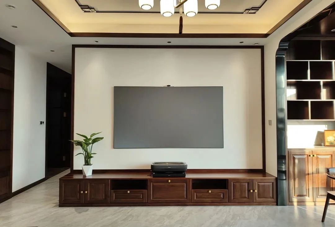 造景侧面设计了一面黑胡桃博古架,在材质上与造景相呼应,满足展示收纳需求的同时对玄关和客厅空间进行隔断,保证空间私密性。