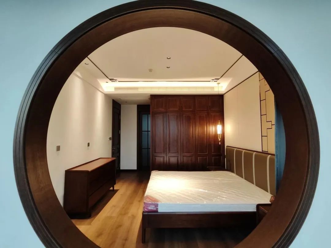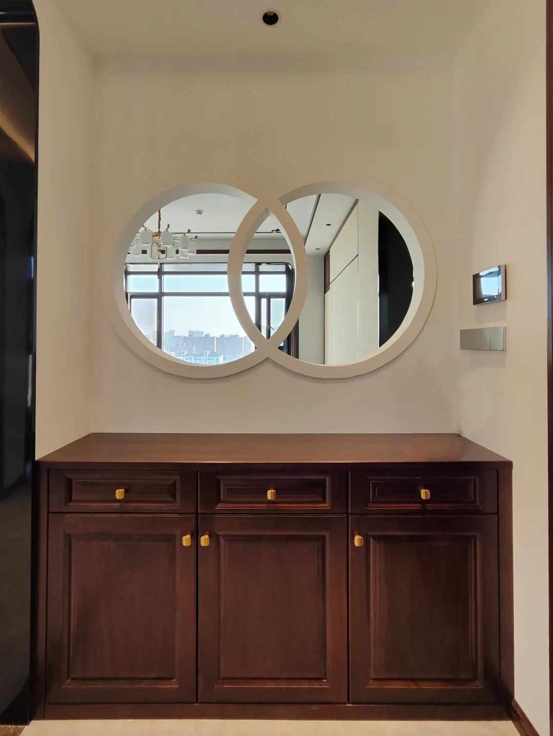 与客厅空间连接处打造双圆形镂空透景增加空间趣味性,视觉延伸通透,圆形镂空与方形实木柜的结合彰显主人【方圆结合 外圆内方】的为人处事态度。