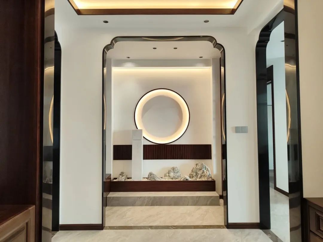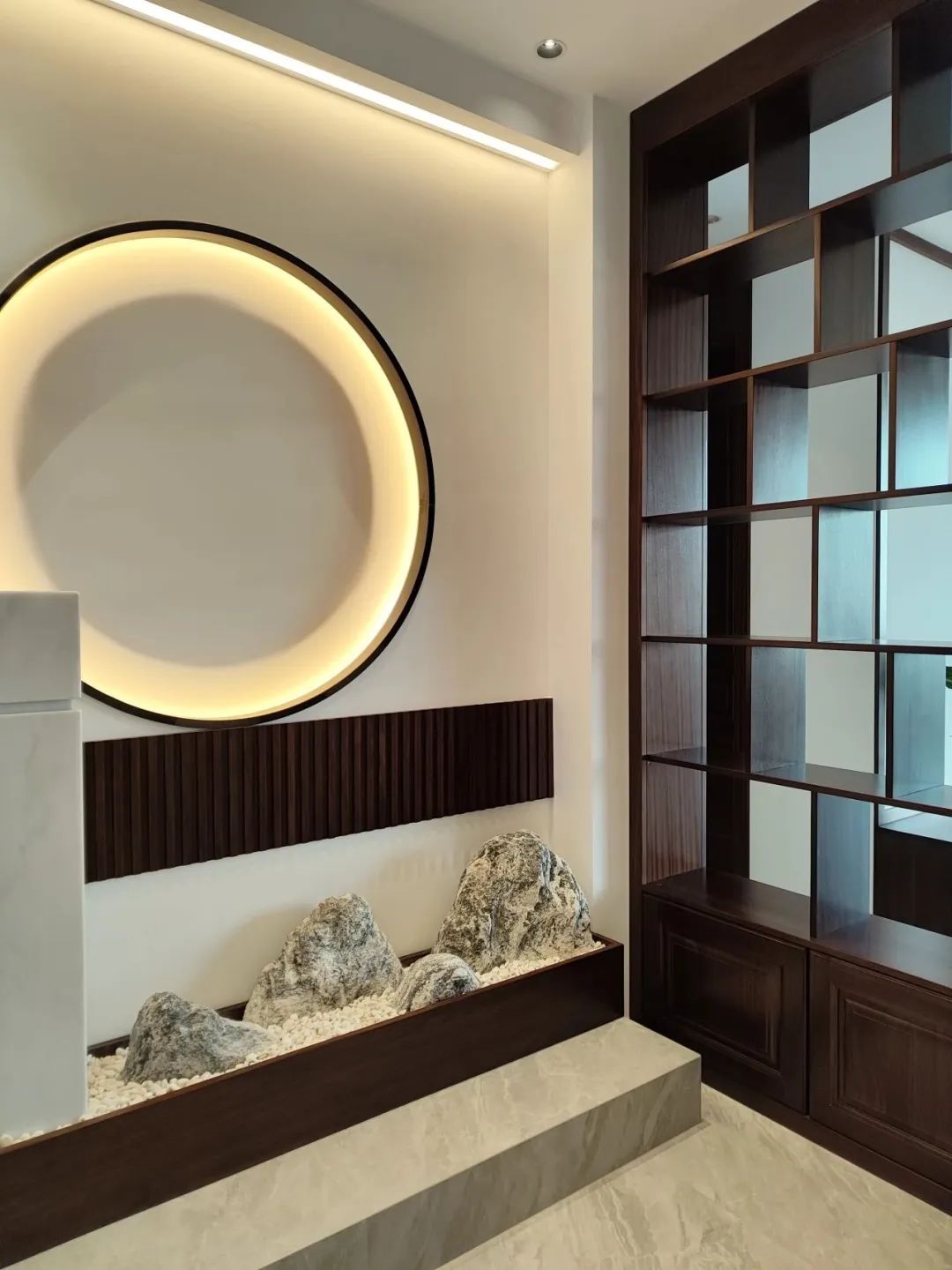 玄关处融合了传统的中国元素和现代的设计理念进行造景设计,将格栅、圆形灯带及石头、实木等自然元素进行巧妙布局和组合,形成一个具有【团圆】寓意的中式景观,方寸之间更显东方诗意美学。