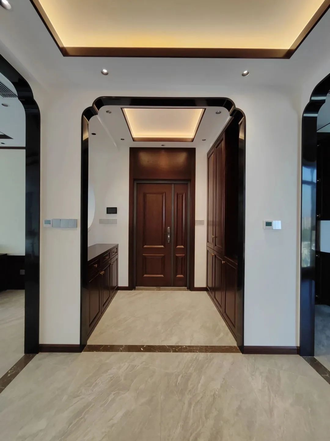 入户门厅处两侧定制两组黑胡桃柜子,满足日常进出门使用需求;