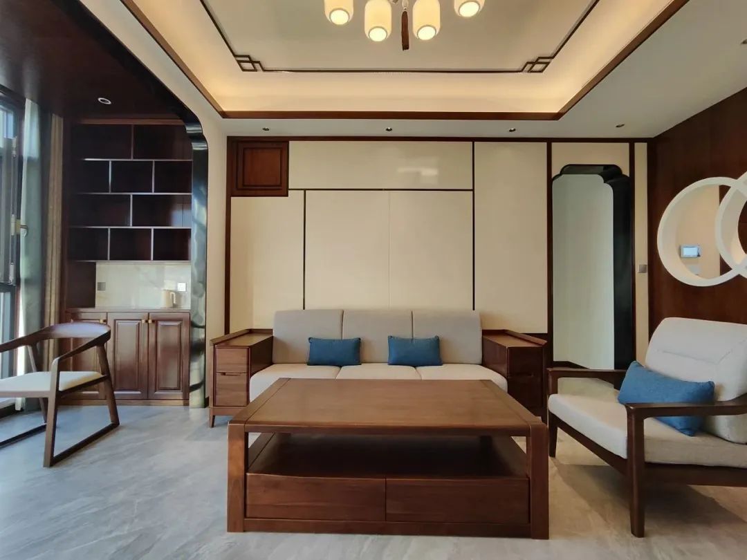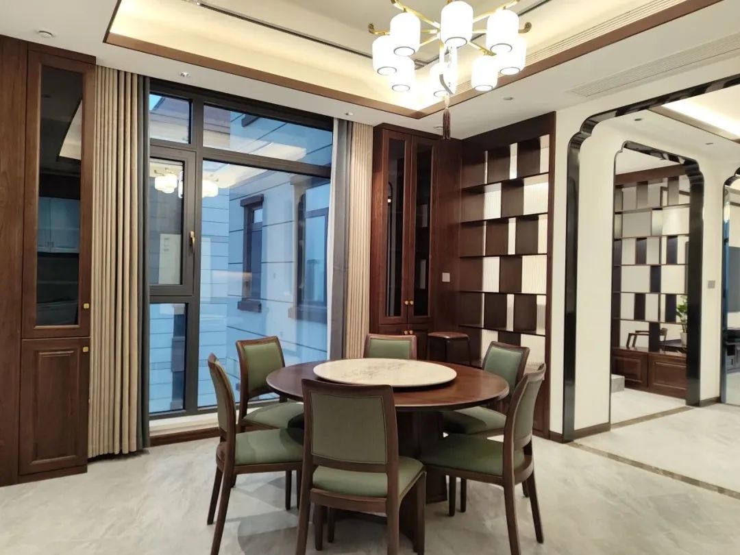整体保持新中式风格基调,通过木饰面、吊顶背景线条等加以修饰,展示室内空间的高级与优雅之美。