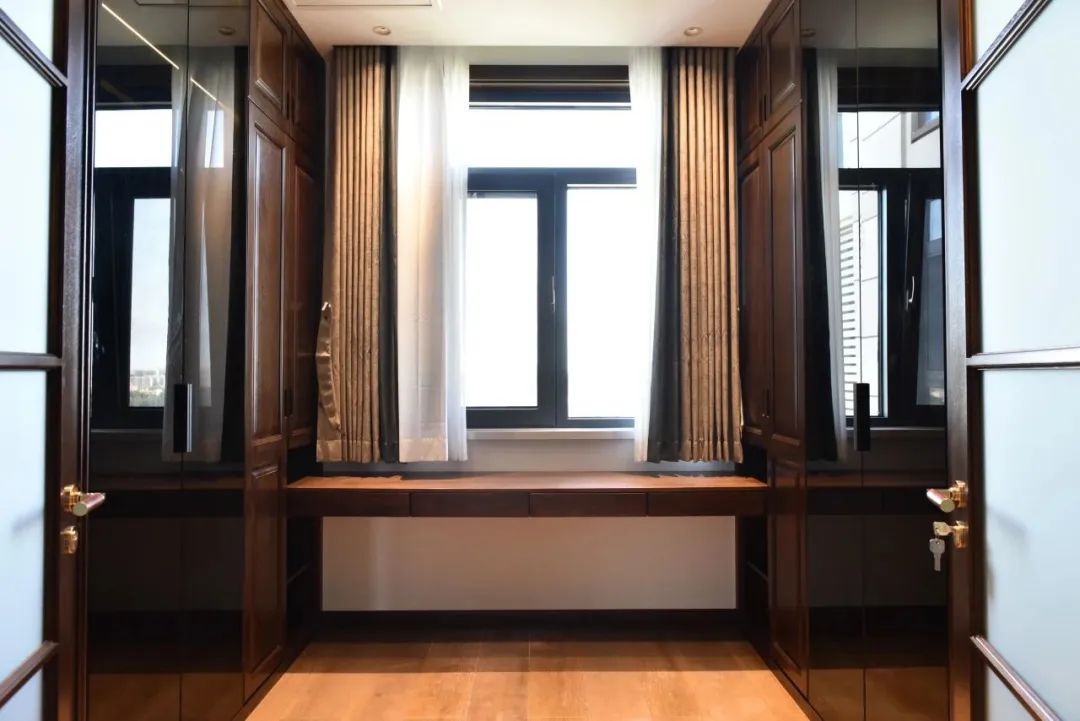 北美黑胡桃和黑玻结合使用,整个衣帽间色调沉稳、静怡、时尚。