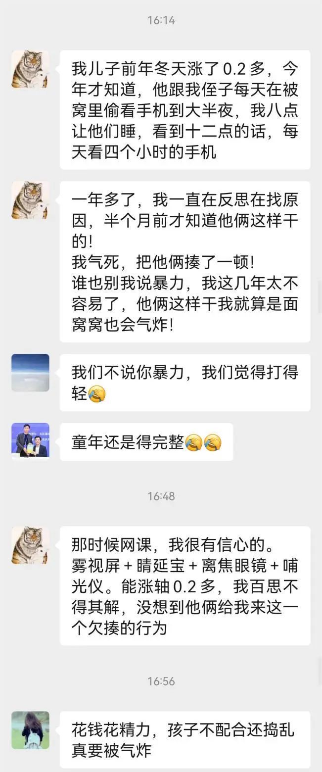 这家孩子更狠,一个冬天眼轴长了0.2mm,原本“雾视屏+睛延保+离焦眼镜+哺光仪”的防控组合,她很有信心,结果让她大跌眼镜,她一直在反思找原因,直到一年后偶然间才知道那段时间发生了什么,“他和我侄子每天在被窝里偷看手机到大半夜,我八点让他们睡,他们看到12点的话,每天看4个小时手机”。“只恨自己没有及时发现”。后面这个情况终止了,眼轴就控制下来了。