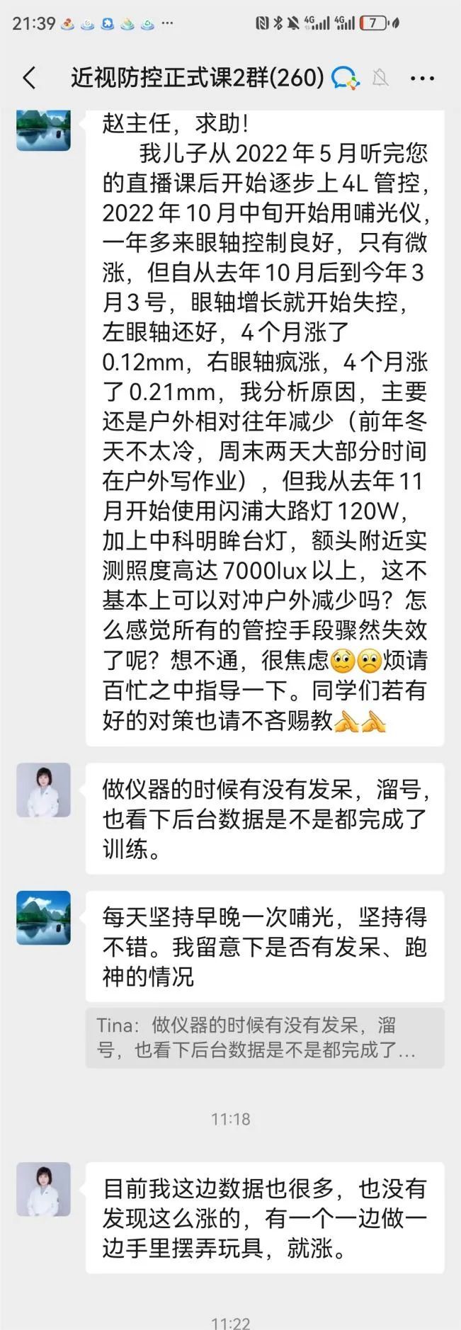 这个家长分享的内容很有价值,她家孩子曾经有段时间防控效果不佳,结果发现早上孩子并没能好好照红光,刚睡醒就去照,结果太困了直接闭眼补觉。她分享经验:“不建议早上刚起来就去做哺光仪,等孩子洗漱完毕清醒了,再做。低龄孩子还需要家长陪同监督做。不要100%信任。”