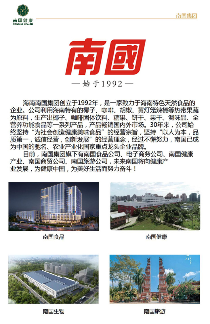 南国集团是一家以生产加工海南特色食品及经营管理旅游购物超市为主导的中型民营企业,26年来专供以椰子为原料的健康营养产品,是中国驰名商标农业产业化国家重点龙头企业。