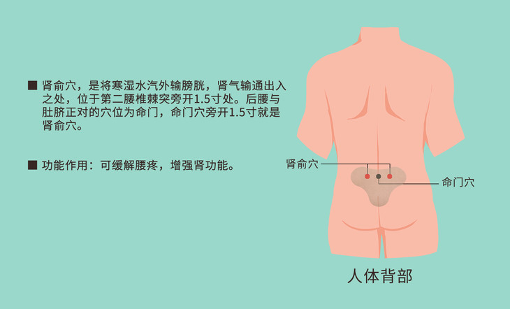 肾俞穴,是将寒湿水汽外输膀胱,肾气输通出入之处。如果寒湿聚于肾部,经络不通,则阳气不足,出现腰酸背痛,肾气阳虚等症。