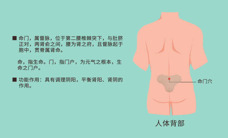 命门,属督脉,位于腰部,腰为肾之府,且督脉起于胞中,贯脊属肾命。命,指生命。门,指门户,为元气之根本,生命之门户,具有调理阴阳,平衡肾阳、肾阴的作用。