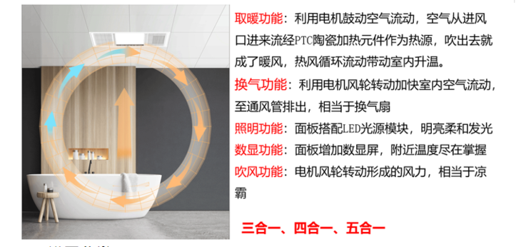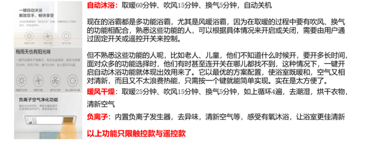 选择好浴霸的取暖方式后,我们就可以针对个人的需求选择适合功能的浴霸了,常规的风暖浴霸有三合一,还有四合一等,其实就是指的对应的功能,目前风暖浴霸除了基础的取暖、换气、照明之外,还有一些集成了一些其他的功能,例如数显、吹风、负离子空气净化、暖风干燥、一键自动模式等功能,可以极大的方便我们的日常生活,具体的功能介绍可参照下图介绍哦~