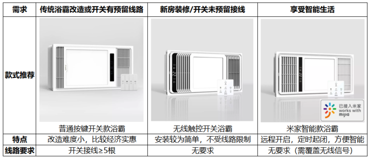 传统的浴霸仅支持墙壁开关进行控制,再方便一些的可能还支持遥控器控制,而随着智能生活的到来,浴霸也随之更新换代,米家智能款的浴霸受到更多年轻朋友们的喜欢,这里如何选择适合功能的浴霸同样可参考下图哦~