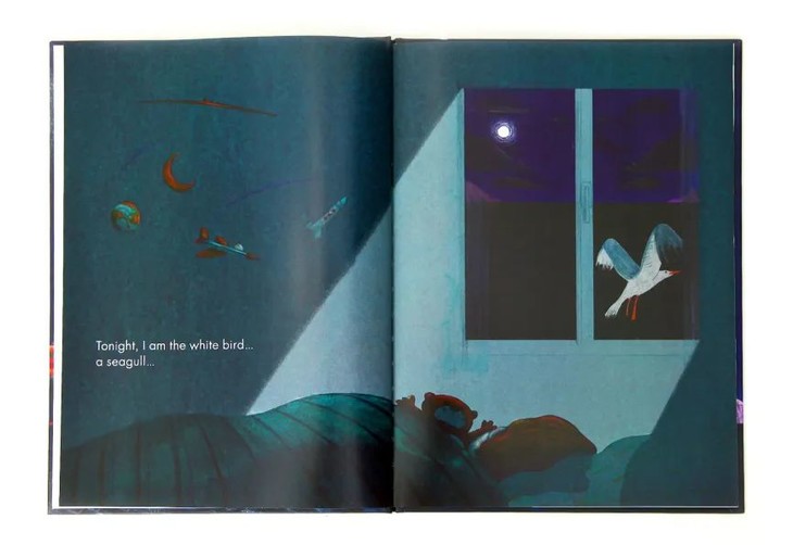 夜深了,男孩进入梦乡。在梦里,他化身成为一只海鸥,飞出了窗外。它在港口的上空不停地盘旋,海浪不断拍打在礁石上,溅起层层浪花。终于,海鸥找到了它的目标。