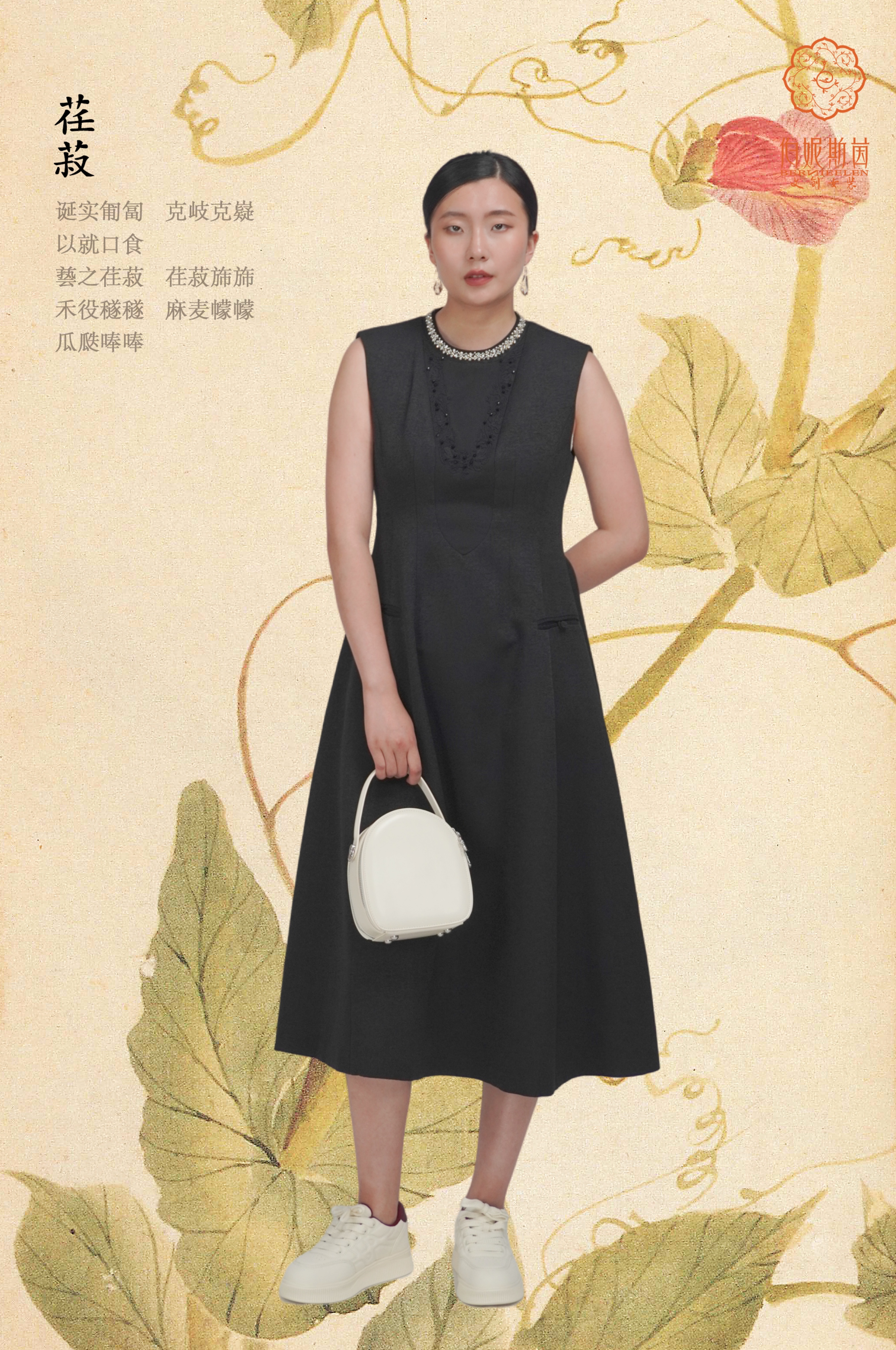 着一袭墨色裙,立于《荏菽》诗意间,领口碎钻如星子落襟,无袖裁就清风态,收腰挽住温婉,大摆漾开自在;