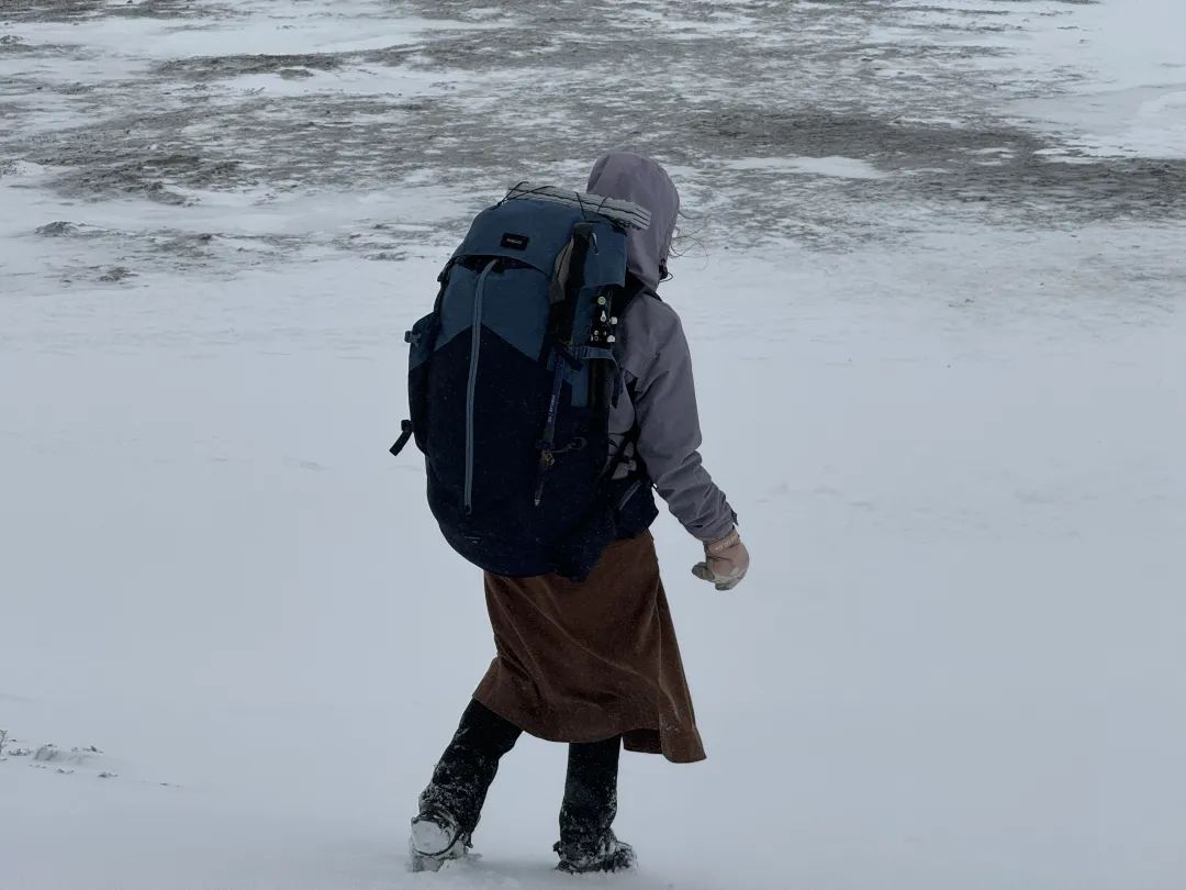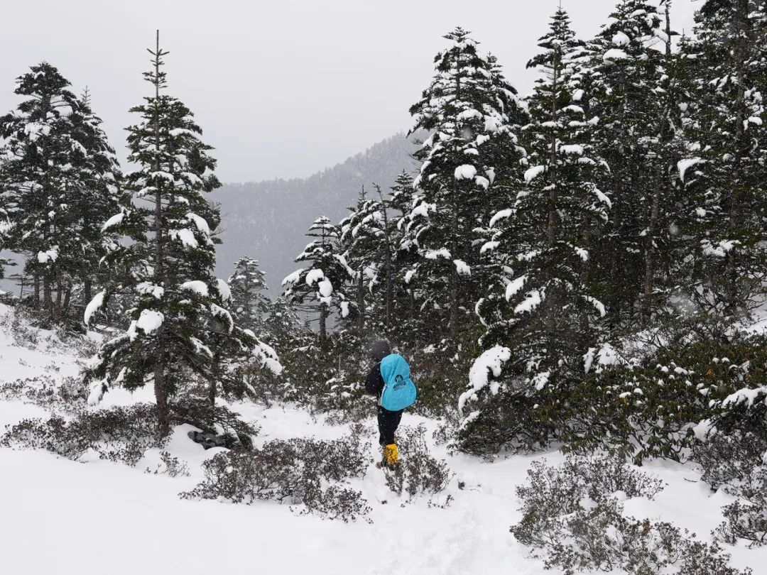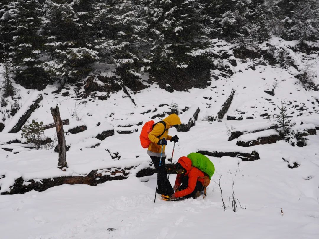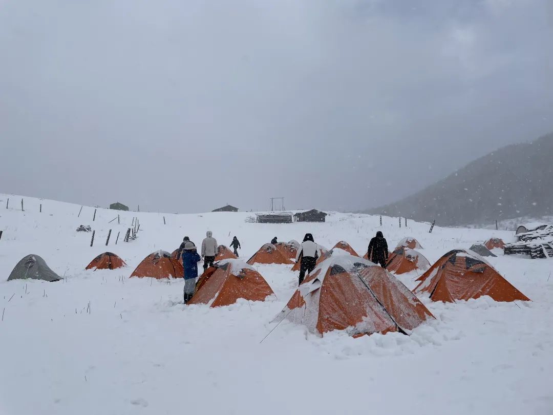 进山的第一晚我闷头睡到大天亮,早上醒来拉开帐篷,好家伙,大雪覆盖整个营地,这是足足下了一整晚啊。美则美矣,冷也是冷极了。