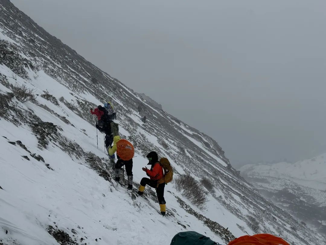 整个氛围相当紧张,大家都被恶劣天气吓到,加上下撤缓慢,身上温度在一点点流失。当时我的手脚也处于麻木的状态,头部隐隐作痛,几次被风吹倒原地坐下。因为担心有人磕到摔到,全程非常紧张,可以说是最从事户外以来最恐慌的一次。