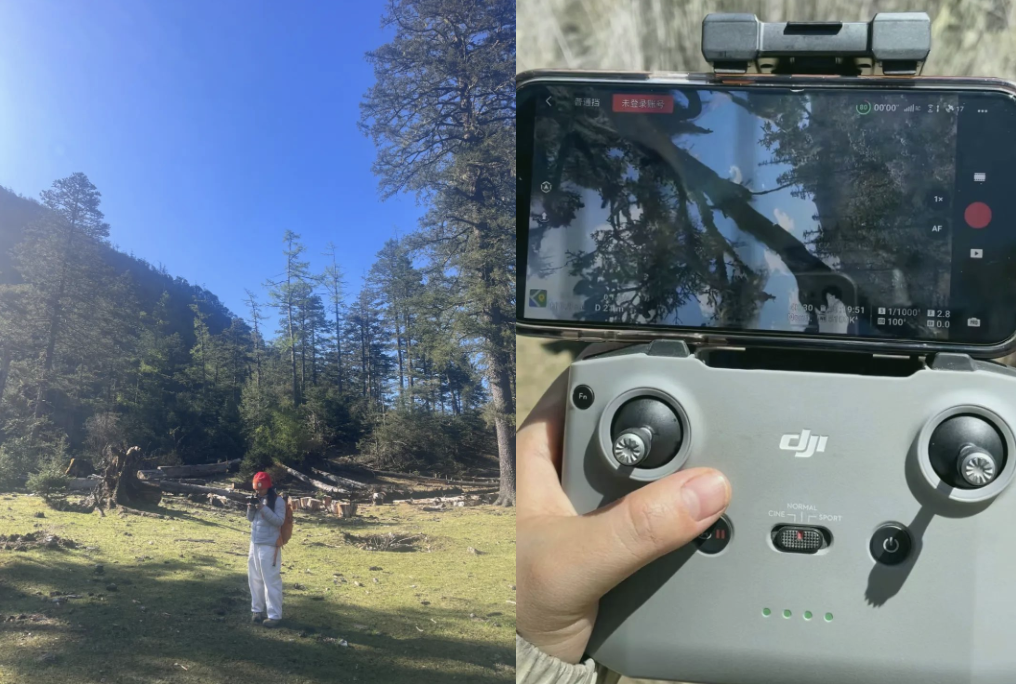 出山的最后一天,天气出奇的好,为了拍下队员在杜鹃花中行走的视频,我自信的拿出无人机来了一段行云流水的极致操作,结果过于沉浸美景,飞机在倒退时被树胡子缠绕,挂在了80米高的大树上。。。