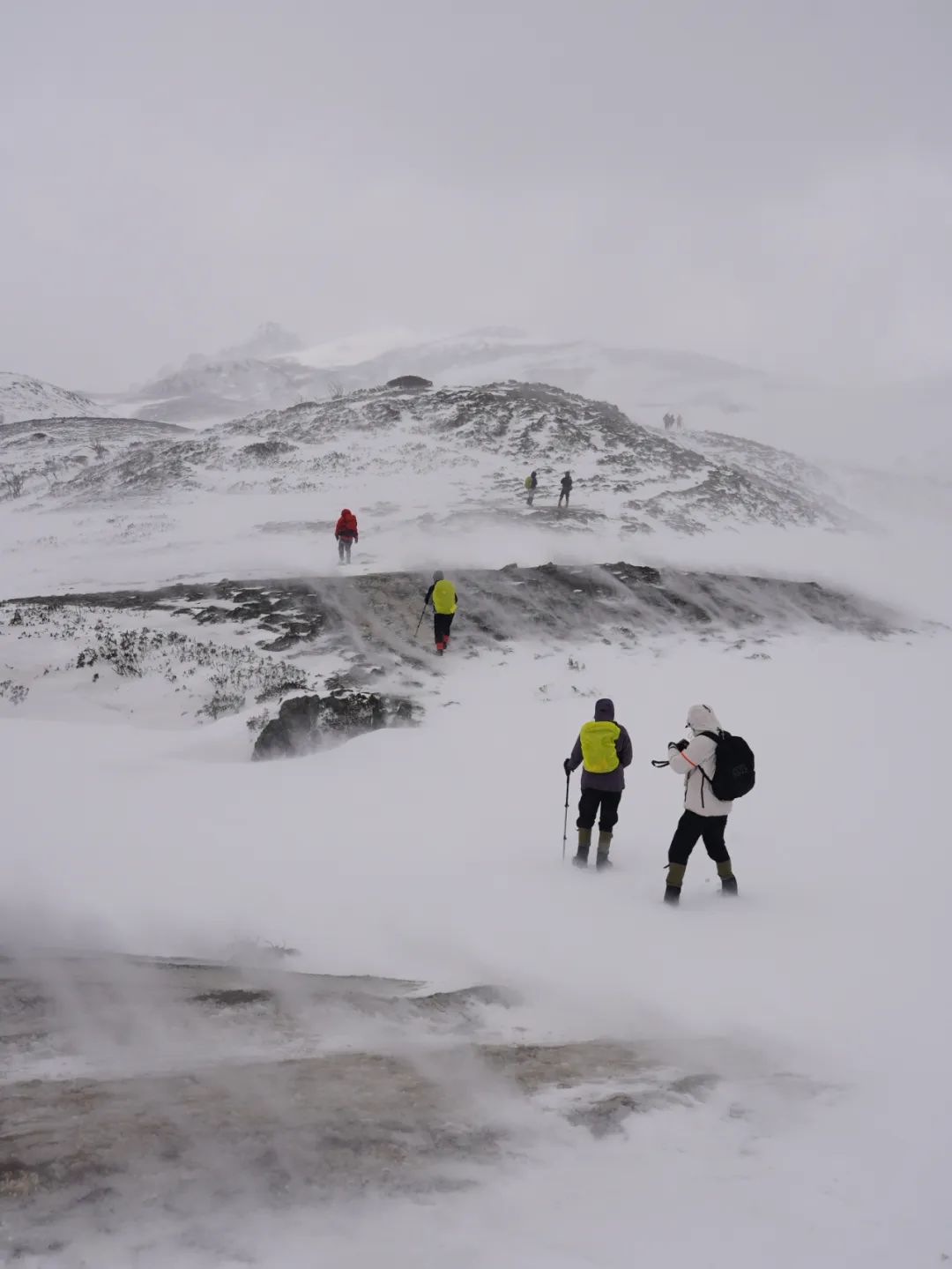 在上阿布吉措湖的绝望大坡途中,从一阵阵间断的小风到持续猛烈的大风,中间只隔了半小时不到,雾气迅速弥漫整座山,能见度瞬间降到两三米,完全找不到方向。大风卷起积雪,寒冷刺骨,每走一步都被风呼呼扇嘴巴子,只能用登山杖扎进雪里,弓着腰才能保持站立。