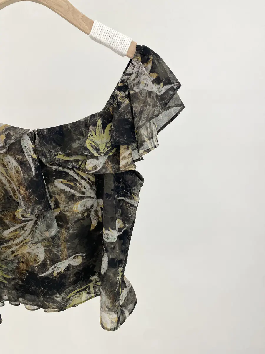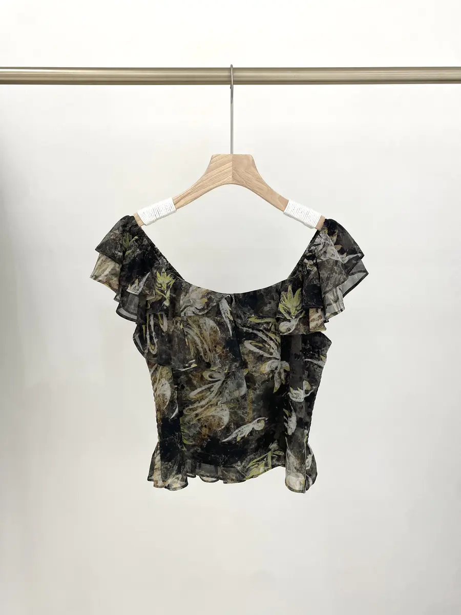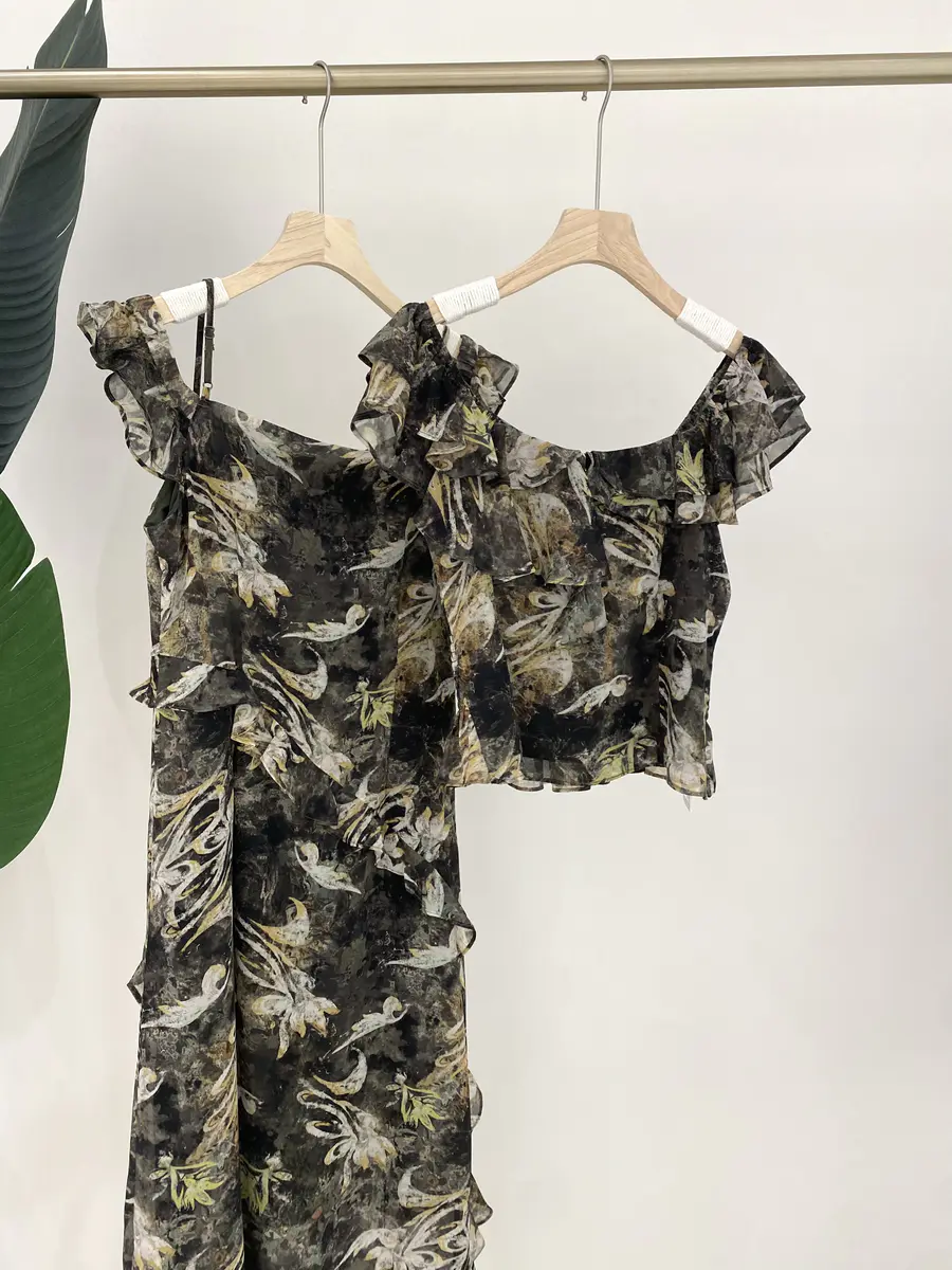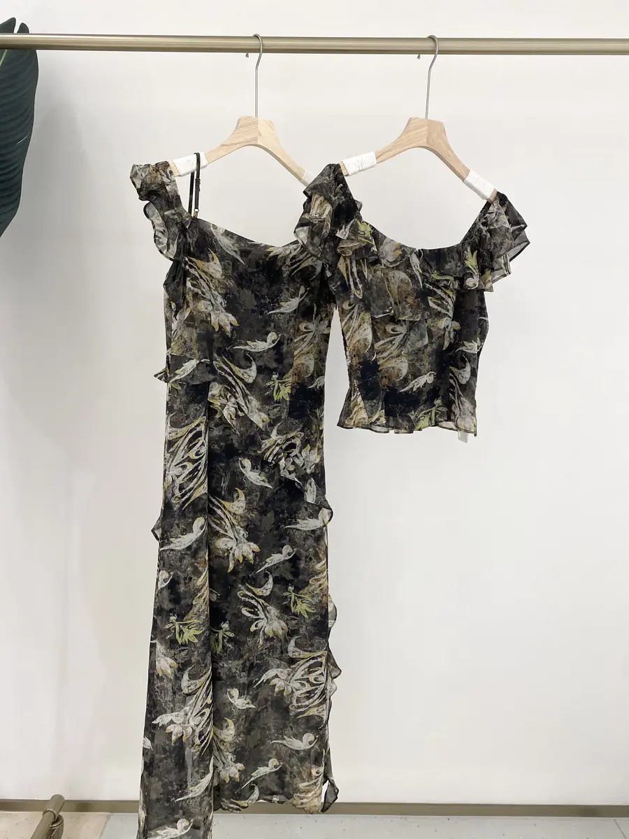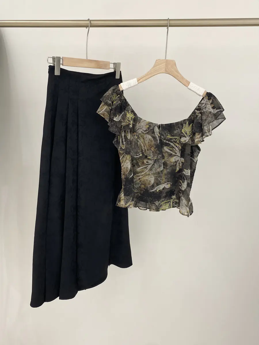 同款面料还研发了一款小衫,也是以荷叶边元素为主调,短截版型,搭配缎面裙尽显优雅~