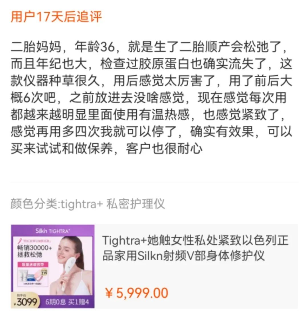 “Tighra设有智能温控系统,是非常安全的,内外两用设计也很人性化,紧致效果不输大型美容院专业射频治疗,性价比更高,护理更私密,操作更便捷。 ”