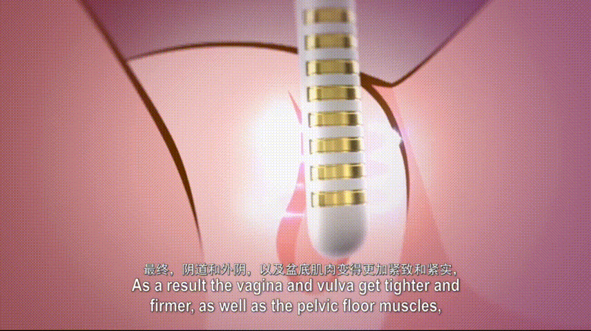 内用:16条金属条循环发射射频,增厚阴道壁,抚平松弛性褶皱,提拉紧致。重连因生产、过度拉伸而断裂的道壁弹力纤维。