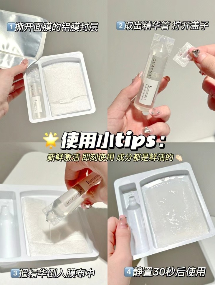 而且,这些精华可不是普通货,它们采用的是“锁鲜设计”,每次使用前需要自己激活,将精华倒入膜布中静置30秒,让成分保持最鲜活的状态。这种设计不仅新颖,还能确保每次敷脸时都是满满的新鲜感!