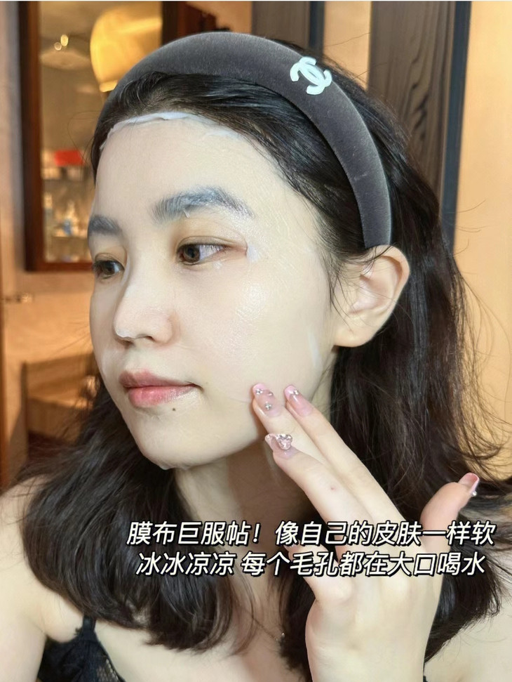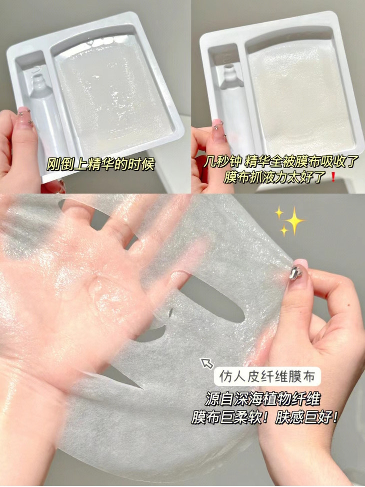 更厉害的是,这种材质源自深海植物纤维,不仅环保,还能牢牢抓住精华液,不浪费每一滴养分。刚把精华倒进去时,你会发现膜布瞬间吸收得干干净净,敷在脸上时,每个毛孔都像在大口喝水。