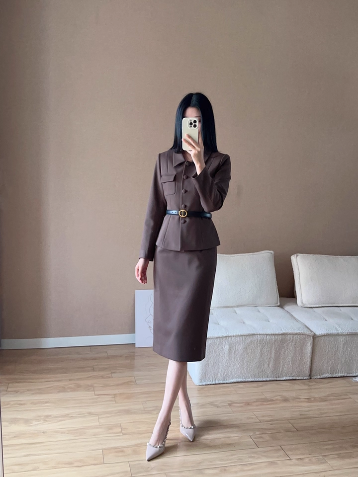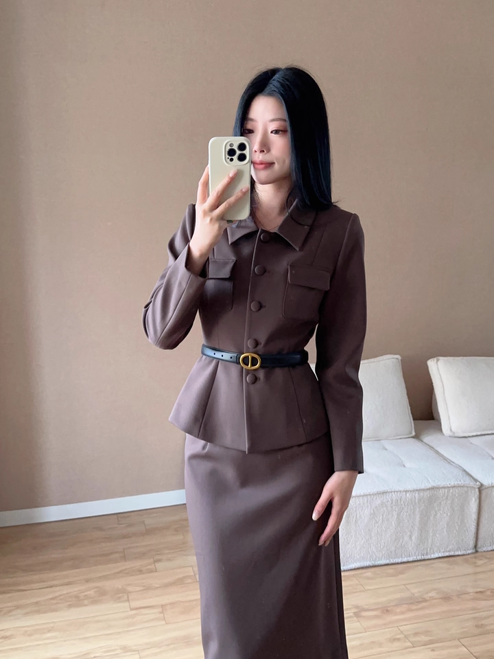 长袖外套的纽扣设计与裙装的简约版型呼应, belt 的点缀更是画龙点睛,将 “精致职场人” 的标签牢牢定格。无