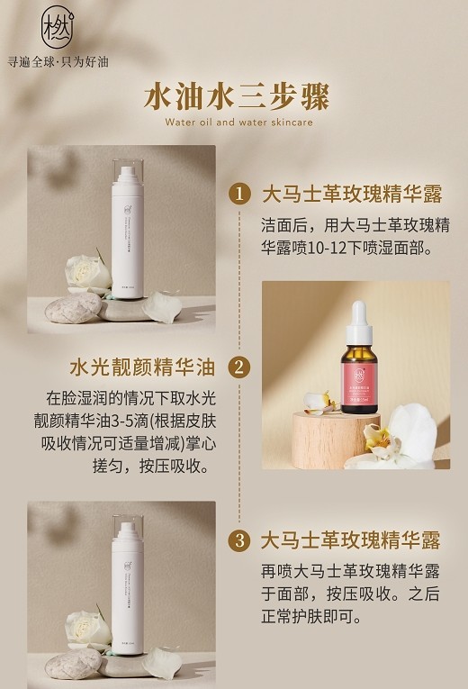 水光靓颜搭配大马士革玫瑰精露,日常护肤 。